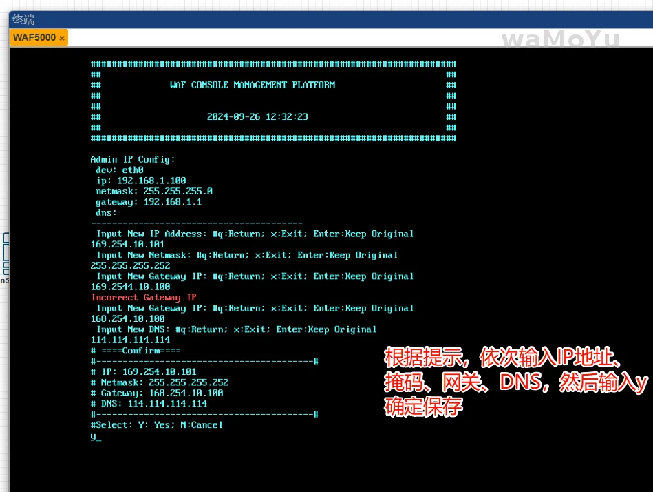 根据提示,依次输入IP地址、掩码、网关、DNS然后输入“y",确定保存即可。