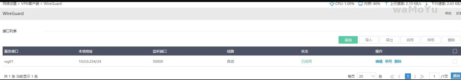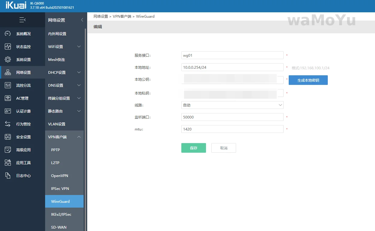 依次点击:网络设置 --- VPN客户端 --- WireGuard --- 接口列表 --- 添加