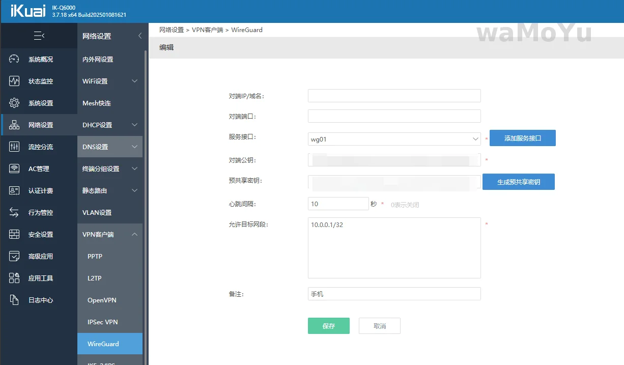 预共享密钥:复制到WG客户端PresharedKey字段(为了安全建议填写)