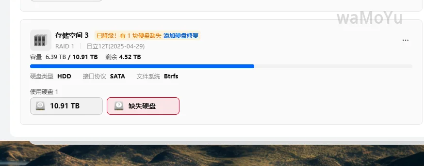 2块12T硬盘组的RAID1,但是感觉用不上,不如拆分后直接用定时备份把关键数据到另一块盘。