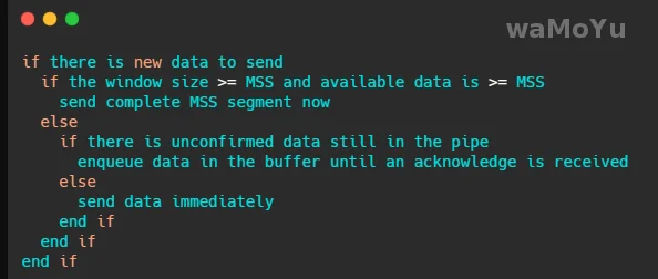 简单的说就是当前能发送的数据和窗口大于等于 MSS 就立即发送,否则再判断一下之前发送的包 ACK 回来没,回来再发,不然就攒数据。