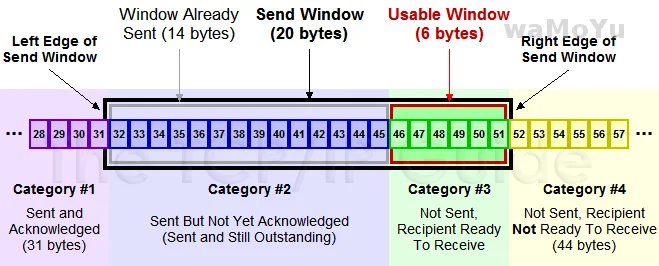 图中的 #1 是已收到 ACK 的数据,#2 是已经发出去但是还没收到 ACK 的数据,#3 就是在窗口内可以发送但是还没发送的数据。#4 就是还不能发送的数据。