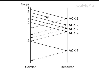 于是又引入了数据驱动的重传叫快速重传,什么意思呢?就是发送方如果连续三次收到对方相同的确认号,那么马上重传数据。
