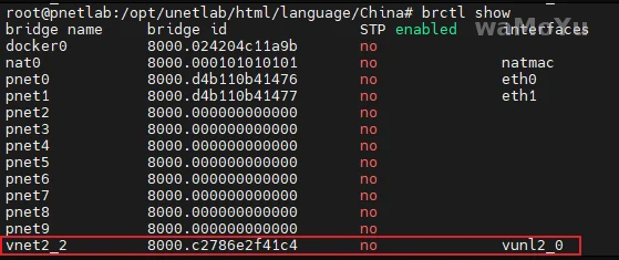 可以在PnetLab命令行界面通过以下命令查看桥接情况