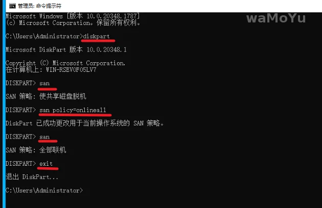 1)进入diskpart diskpart 2)查看SAN策略 san 3)使用diskpart更改SAN策略 san policy=onlineall 4)再次查看SAN策略 san 5)退出diskpart exit