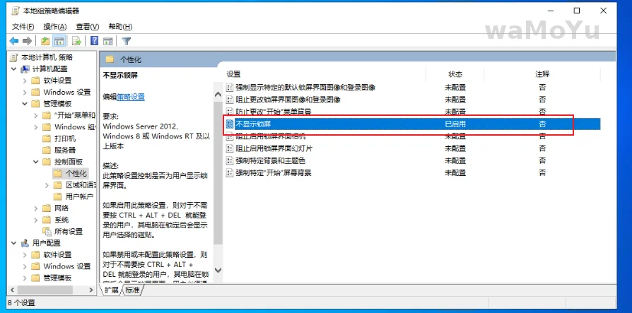 4、通过“gpedit.msc”启用"计算机配置管理模板控制面板个性化不显示锁屏"优化登入体验。