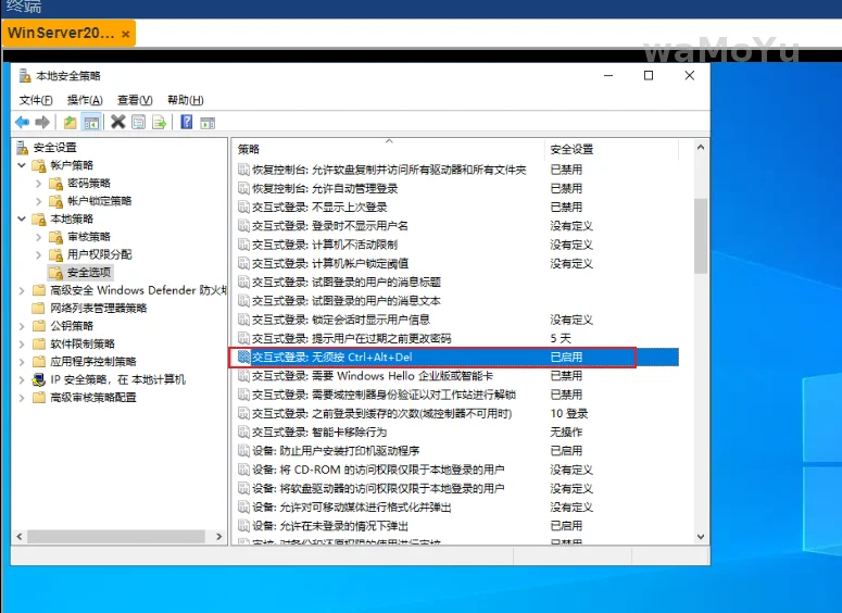 3、启动"本地安全策略""本地策略""安全选项""交互式登入:无需按CTRL+ALT+DEL"。