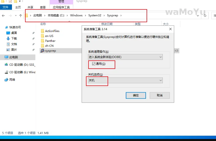 C:\Windows\System32\Sysprep文件夹,运行sysprep.exe。注意!记得勾选通用和将关机选项改为关机完成后,系统会自动关机。