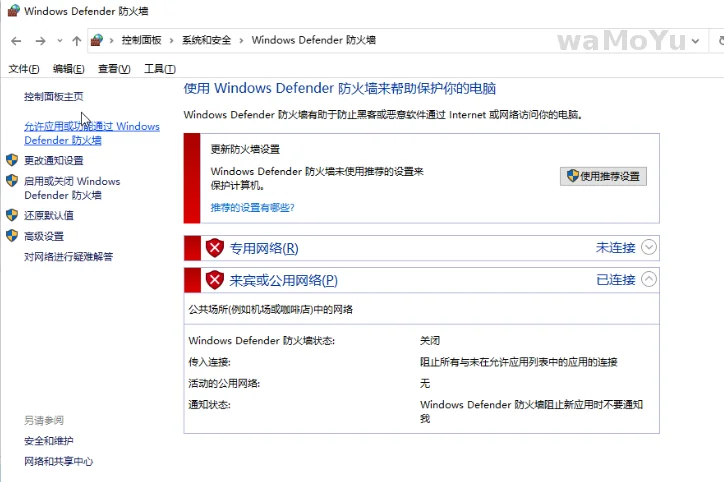 关闭专用网络、公用网络 Windows Defender 防火墙(关闭防火墙);