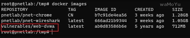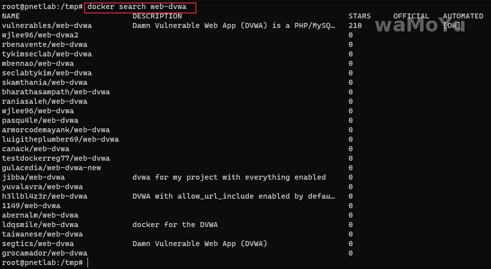 docker search {镜像名称}下图案例中,所需镜像为dvwa的docker镜像