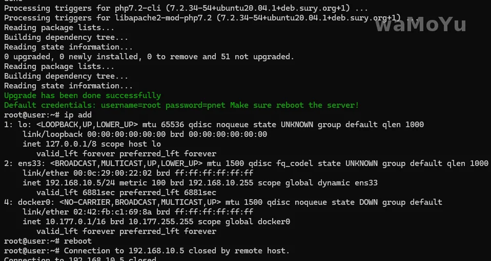 重启服务器后,输入默认账号和密码(root/pnet)登入,会有设置向导,要求你重新设置root密码、网络等,设置完成后自动重启。