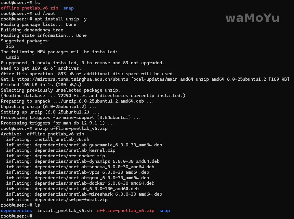 # 1)进入安装包所在目录 cd /root # 2)安装解压软件 apt install unzip -y # 3)解压安装包 unzip offline-pnetlab-v6.zip