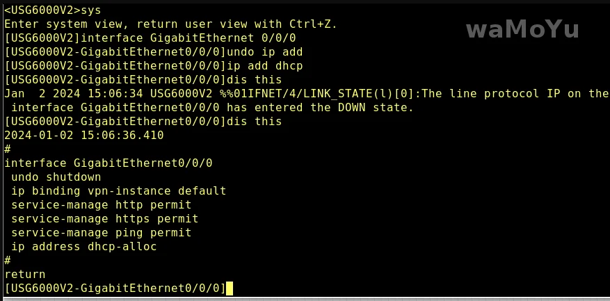 sys interface GigabitEthernet 0/0/0 undo ip add ip add dhcp dis this
