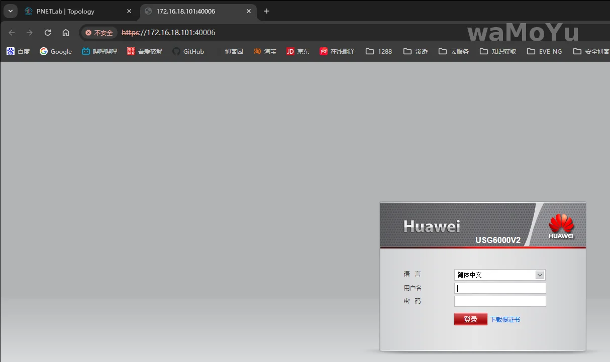 华为USG6000防火墙默认管理地址是https://192.168.0.1:8443,为https协议,并且指定了IP和端口号,所以该节点使用https控制台,设置映射端口为8443,还需要先进入命令行修改ip为dhcp获取(直接修改为169.254.10.101/30也是可以的)。